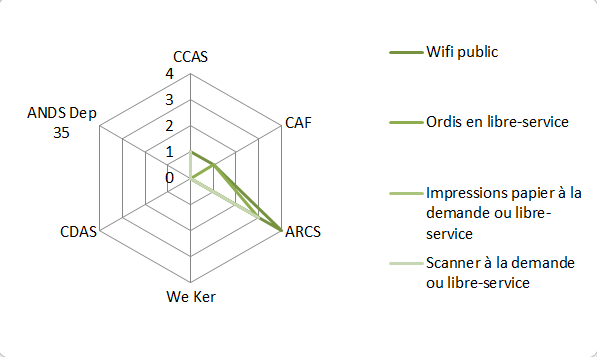 Il y a un gros potentiel d'espace-temps à partager si on décidait de mettre en commun wifi, postes informatiques, voire de nouveaux moyens (matériel de réparation, bibliothèque sur le numérique pour les nuls par ex, etc). Ceci nécessiterait armoires à codes, configurations-types etc. Mais permettrait une voie originale à moyens constants du type : objectif = doubler la surface de contact en espace-temps avec l'habitant, puis la tripler...